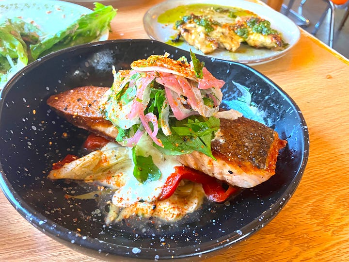 For our main course, we ordered the tenderized chicken thighs ($19) and the King salmon ($29). The thighs arrived perfectly grilled and generously topped with a vibrant cilantro pesto and a vigorous mojo de ajo. The dish fascinated with subtle, now-you-taste-it/now-you-don’t heat, a result of the artfully balanced herbs and spices.