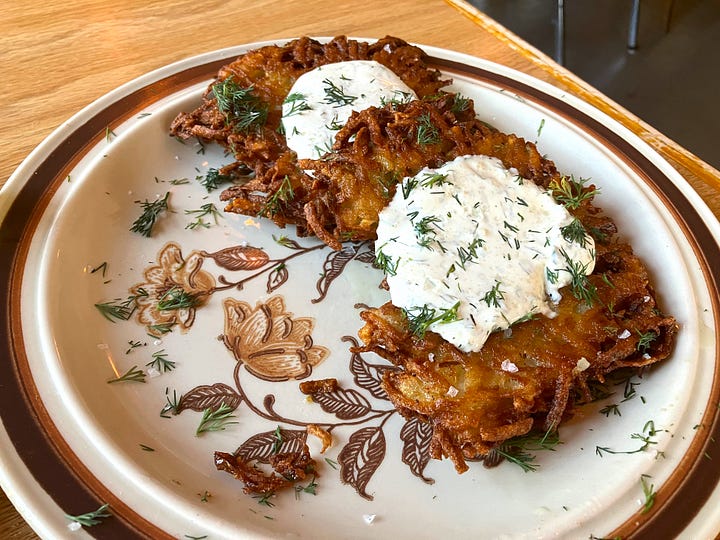 The side dishes were equally engaging: nettle-ramp pesto, lemon, and a wealth of fresh dill added the bright, grassy-fresh flavors of spring to the earthy, wood-fired asparagus, and the creamy burrata made it all even better. And if they have potato latkes on the menu, snag ’em—with their crackly-crisp, golden-brown exterior and tender, fluffy interior, they’re everything you want in these hearty and traditional fritters.