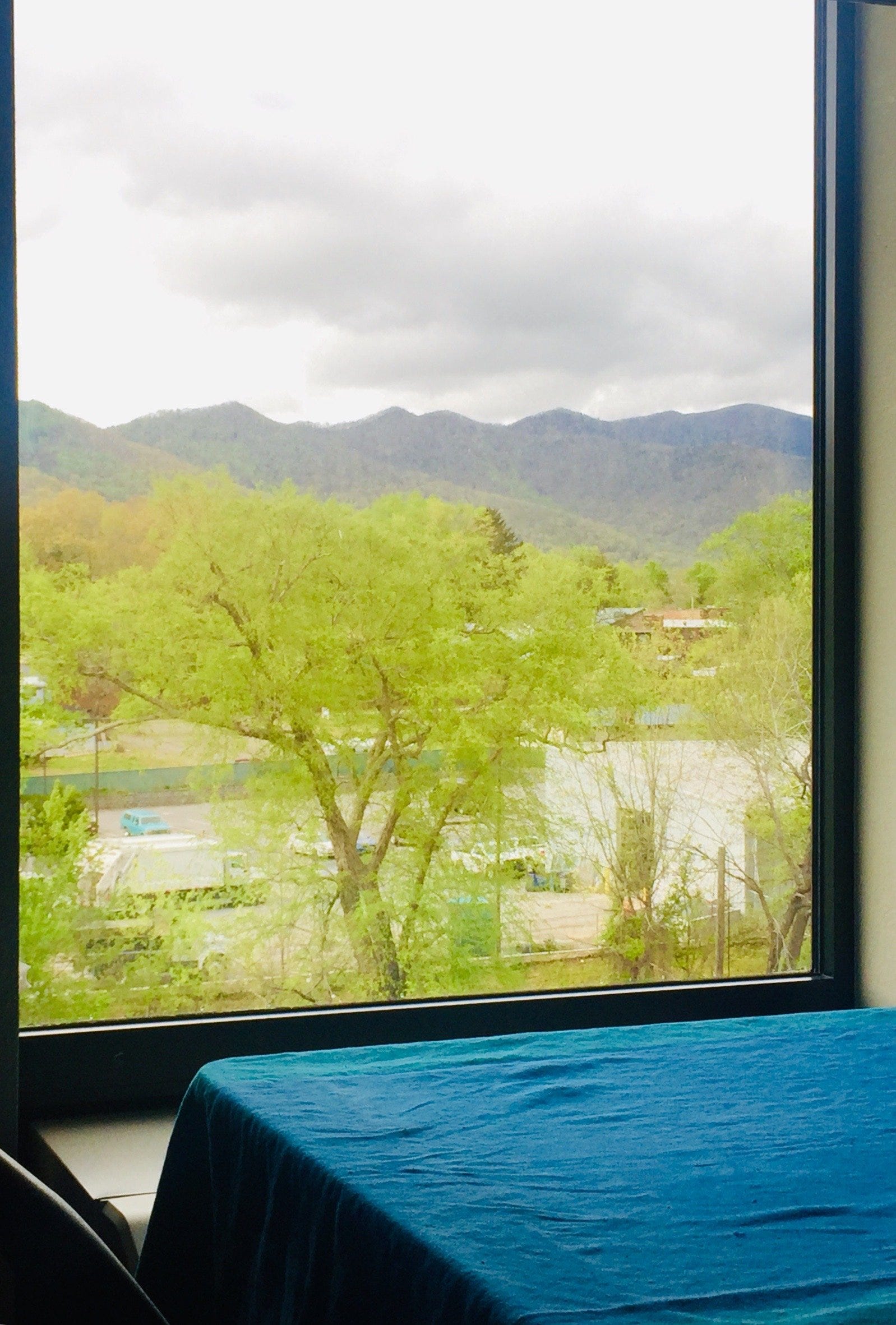 Of course, we always travel with a table … and we always set it by the window. Problem solved.