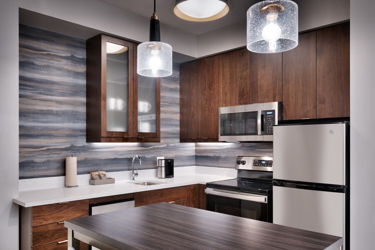 All the kitchens in these American hotel chains offer a cook-top, dishwasher, microwave, cooking pans and utensils, plates and flatware, and a three-quarter to full-size refrigerator, unless otherwise specified. Note, however, that very few of them offered ovens.