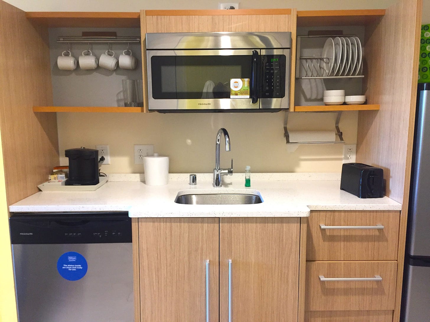 Downsides: Home2Suites do not have cooktops! They have everything else (dishwasher, microwave, nice-size fridge, etc.), but if you want to cook in a pan, you have to borrow an induction cooktop from the front desk. That’s no problem … except you can only cook with one pan. Therefore, this kitchen-furnished hotel chain is probably best if you’re only cooking for two.