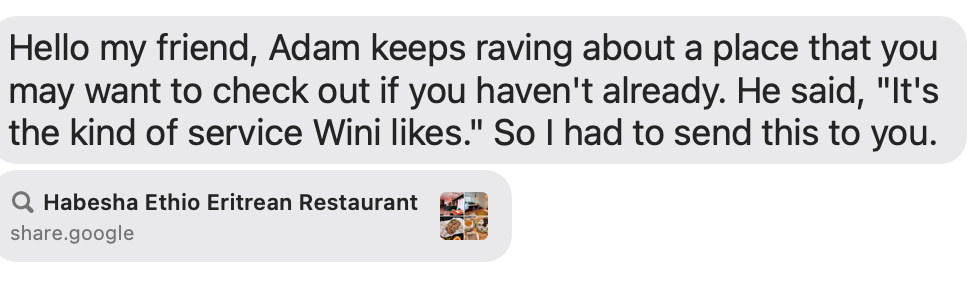 Curious about Ethiopian Food? Let This Inviting Spot Lead the Way The welcome sets the tone, and the flavors do the rest.Wini MoranvilleNov 17, 2025∙ Paid189ShareI got this text from Staci, a long-time friend and reader. You’ll see why it made me sit up and take notice:As you know, service—or really, hospitality—matters deeply to me. And not just the tuxedoed…This post is for paid subscribersSubscribeAlready a paid subscriber? Sign inPreviousNext