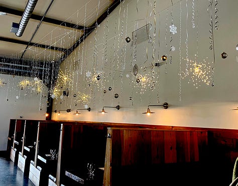 I noted that the place was decked with holiday lights, less prominent, of course, during the day. But at nighttime, the place will be more aglow, complete with candles, I’m told. P.S.: Look for Ramen Night on Fridays.