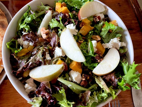The pizza was lovely. The expert thin, crisp, puffy-edged crust always delights. While I felt the toppings were a bit skimpy, I loved the mix: in this case, garlic-roasted mushrooms, Gorgonzola, white sauce, dried tomatoes, and fresh oregano. How nice to have an autumn-focused salad, too. The seasonal touches were spot-on—winter squash, toasted nuts, pears at their peak. Yet, once again, the greens dominated. Must every salad begin with a mountain of lettuce? I’d trade half of all that lettuce for just a few more nuts, pears, and squash.