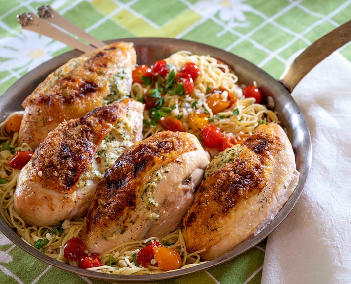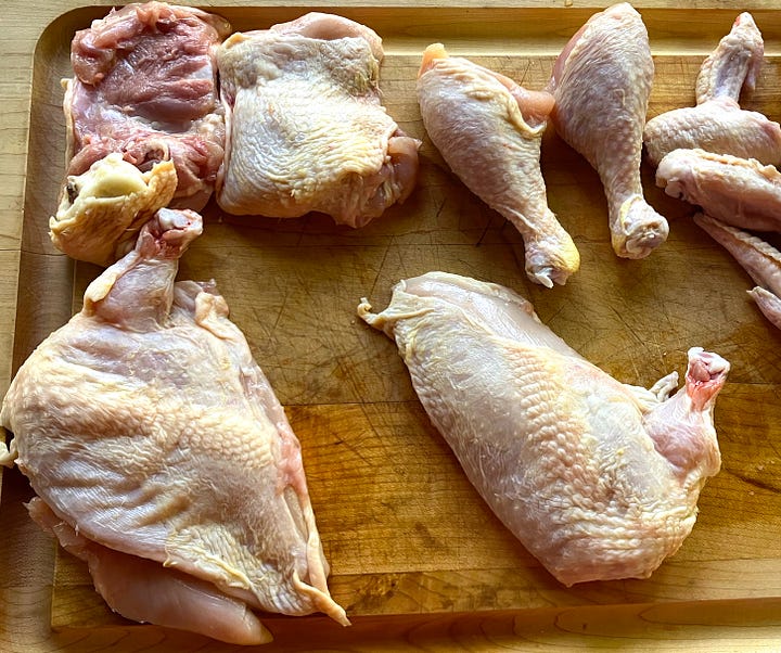 To get this cut from Old Station, you’ll need to buy a whole chicken and request that the breasts be cut airline style. I also asked them to bone the thighs, but leave the skin on. A chicken cut this way easily feeds four diners. They finished this special order in the time it took me to complete the rest of my shopping.