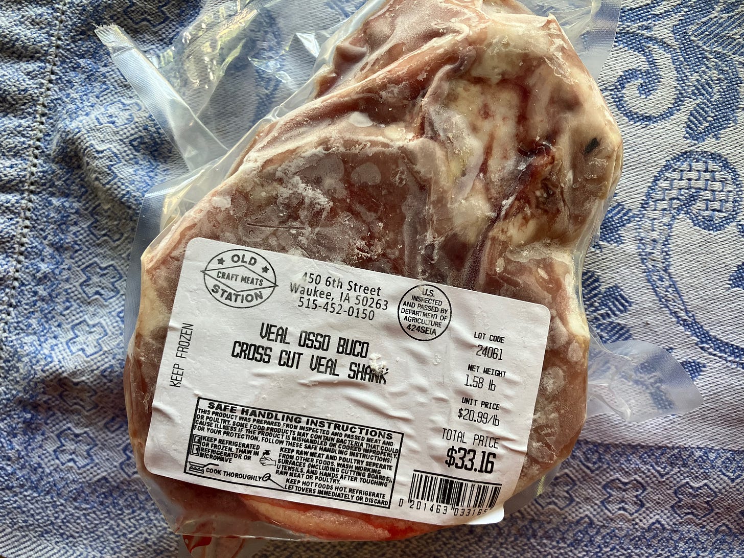 Osso buco (that’s “bone with a hole,” in Italian), are cross-cut veal shanks, and I haven’t seen them anywhere in town since Dahl’s closed (how I pine for the days when they put out their specialty meats on Thursdays!).