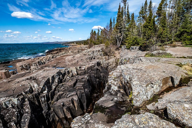 Lake Superior is the largest freshwater lake in the world (holding 10 percent of world’s fresh water) by surface area and the third-largest by volume. That is to say, humongous; it’s basically a sea. The lake is a rift zone that was first layered with volcanic bedrock a billion years ago, then excavated into a basin by Ice Age glaciers grinding down from the north, and then filled with water by the last retreating glacier.